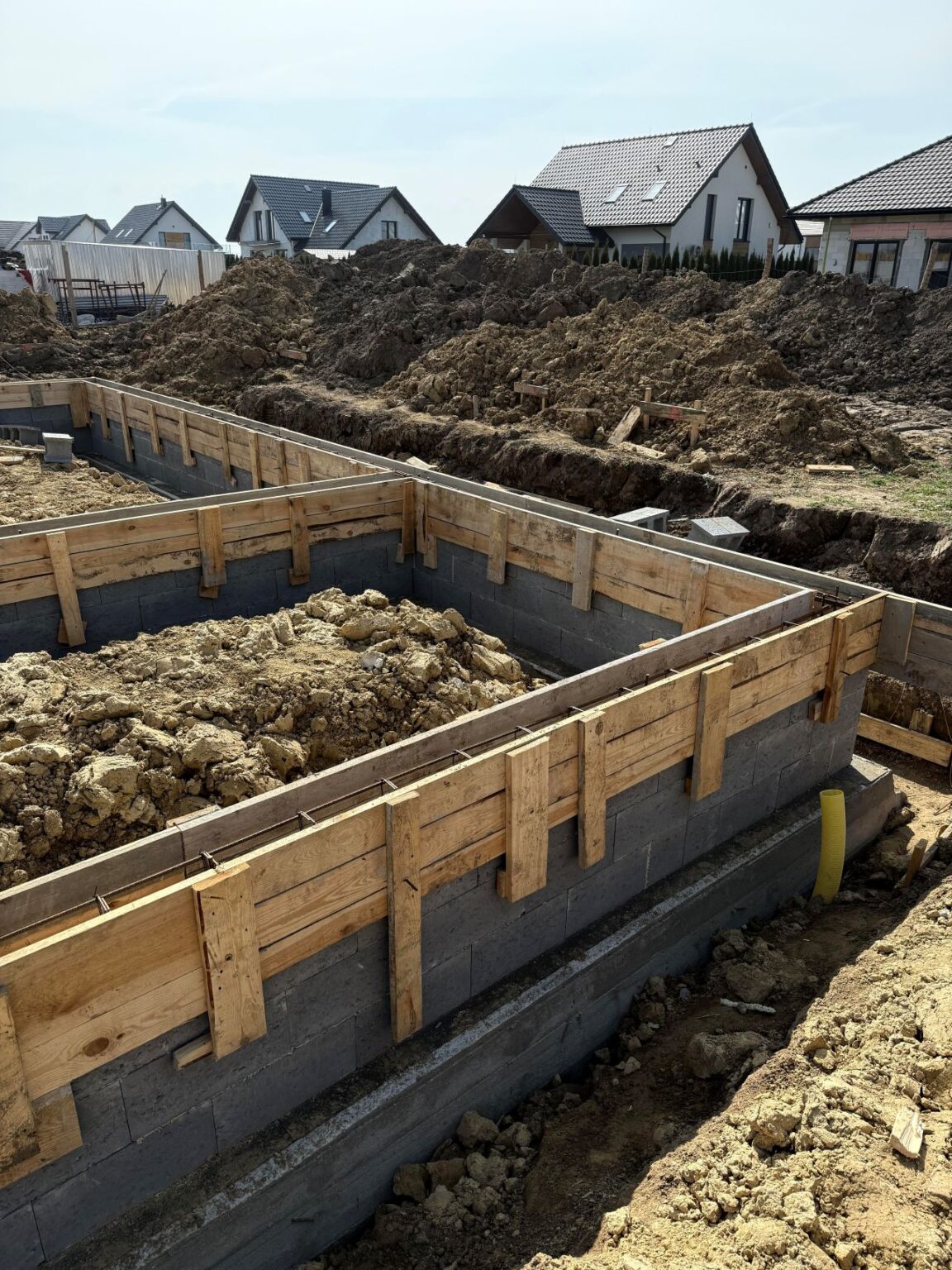 Wykonywanie ław i ścian fundamentowych, zasyp fundamentów, układanie kanalizacji oraz wylanie chudego betonu.